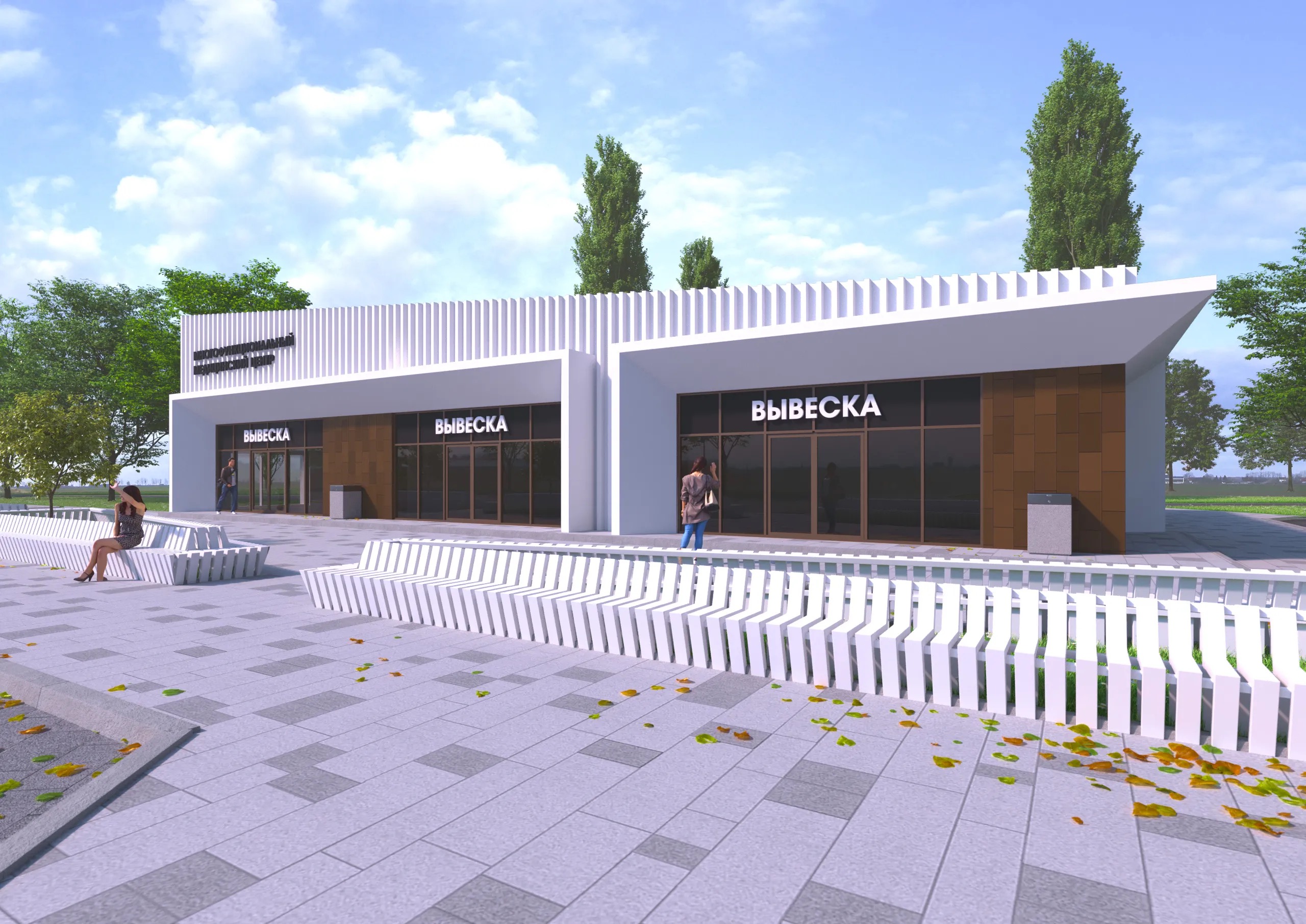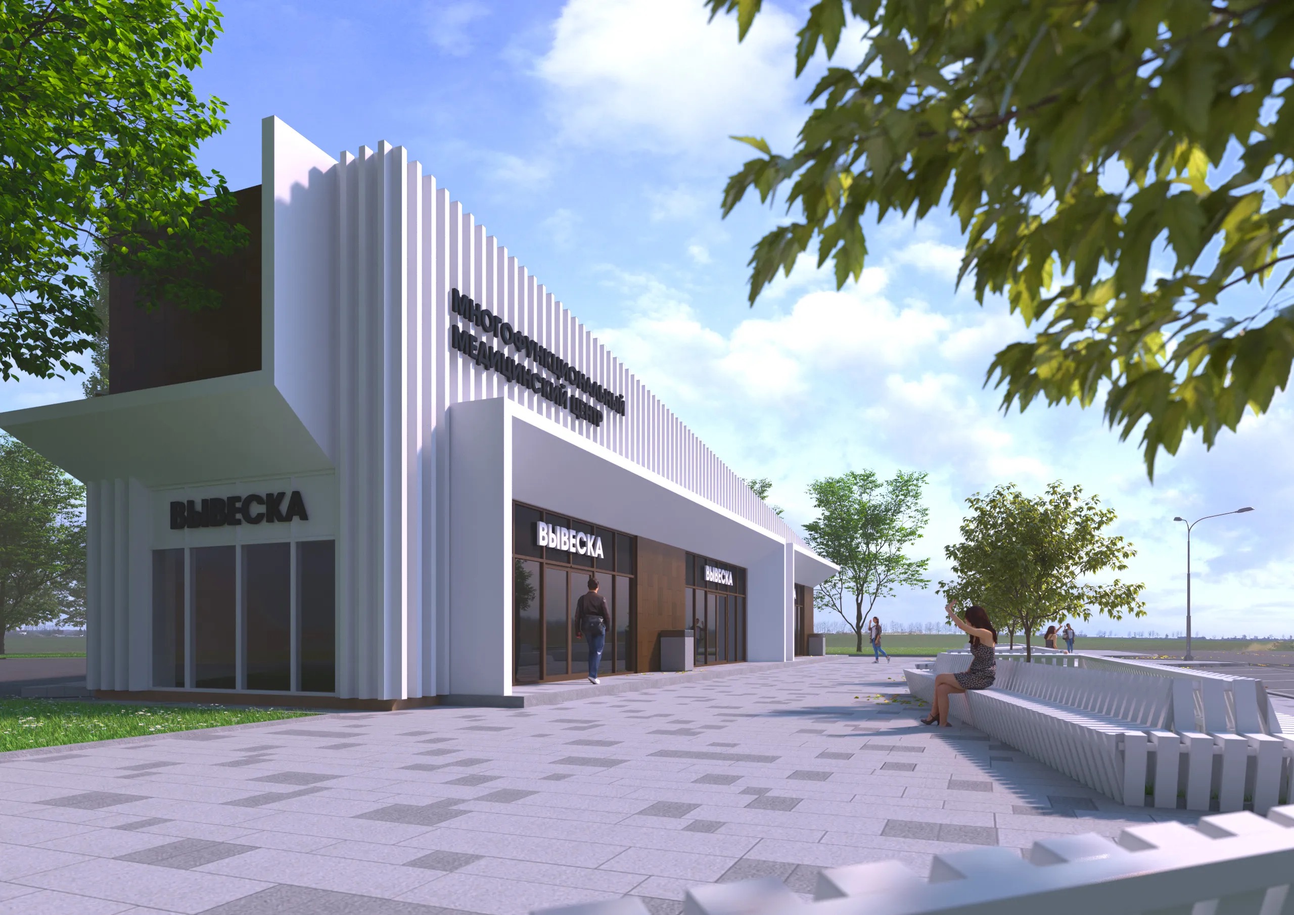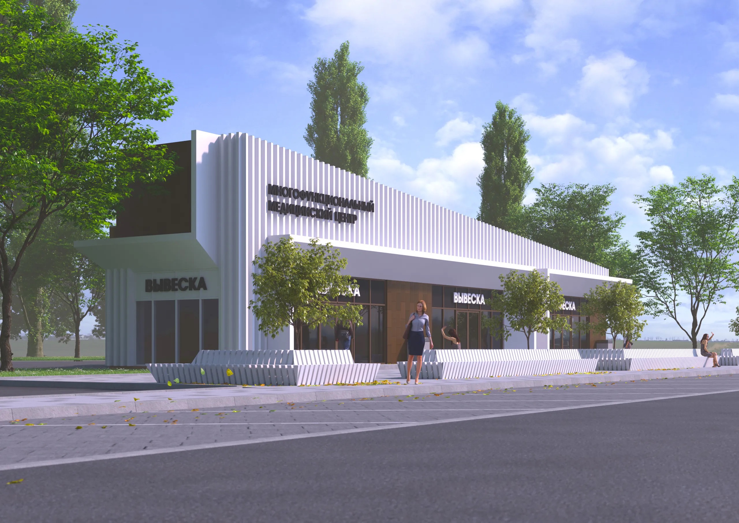 Входы в здание обрамлены порталами из композитных панелей. Конструктивно входы в здание – витражи из металлического профиля с заполнением двухкамерными стеклопакетами.